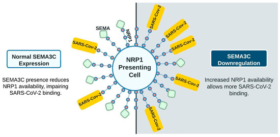 Proposed model of SARS-CoV-2 and SEMA competition for NRP1 interaction. With fewer ligands, more receptors are available for SARS-CoV-2 binding. Upregulated tRF5s are not shown in this diagram for clarity.