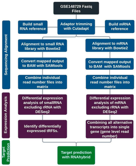 We used cutadapt [27] to trim 3′-adaptor sequences and discarded read sequences of size less than 15. The sequences trimmed from the small RNAseq data were AAAAAAAAAA and TGGAATTCTCGGGTGCCAAGG, and the sequences trimmed from the total RNAseq data were AGATCGGAAGAGCACACGTCTGAACTCCAGTCA for pass 1 and AGATCGGAAGAGCGTCGTGTAGGGAAAGAGTGT for pass 2, as referenced from Illumina. We used bowtie2 [28] to align reads to reference sequences, allowing for one nucleotide mismatch for small RNAseq analysis. The reference for small RNAseq was built from combined small RNA sequences of (1) downloaded sequences of sno/miRNA tract using the UCSC Table Browser [29] and (2) prepared tRFs from 33 unique nucleotides of 5′-end of tRNAs (tRF5) and those of 3′-end (tRF3) as well as upstream pre-tRNA sequences (tRF1) of mature tRNAs. To build tRF references in more detail, we downloaded all tRNA identified from UCSC genome browsers and used the tRNA names as their root names. 33 nt is 1-4 nucleotides longer than most tRF5s and, based on years of observation, enough to effectively identify the tRFs using botwtie2 software (version 2.4.1). 53.5% of tRF5s were identified as redundant sequences and were thus removed, keeping only representative ones. For tRF3 references, we did not include ACC, the mature tRNA-added sequence, at the 3′-end. To build the reference for total RNA mapping, we downloaded NCBI RefSeq transcripts using the UCSC Table Browser. The mapped sequences were then processed using SAMtools [30] commands view, sort, index, and idxstats to obtain read counts for each transcript. Figure 4 shows the schematics of the process.