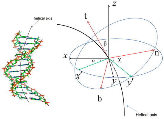 which , , . It should be noted here that the frame is obtained by the information through the site and points. The value of the Euler angle is obtained through the information of and . Therefore, when calculating the difference between the Euler angle, the information of the total four points of the head and tail is a blind spot. The parameter is the distance between adjacent base pairs, because each site is set on the average location of each base plane, and the minimum unit is 1 bp. Here we set , because is the rotation angle between consecutive base pairs in the helix.