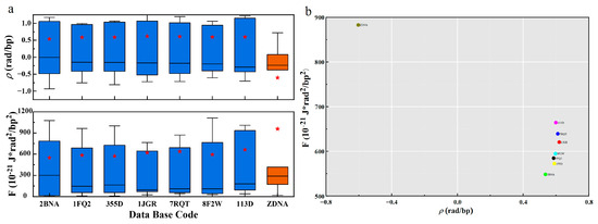 The energy distribution of different DNA structures. (a). Boxplots of F and for different PDBs. The blue data indicate the B-type structure, the orange data indicate the Z-type structure, and the red stars indicate the average values. (b). PDB distribution plot of mean and mean .