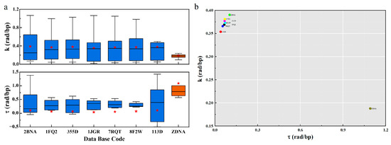 The geometric distribution of different DNA structures. (a). Boxplots of and for different PDBs. The blue data indicate the B-type structure, the orange data indicate the Z-type structure, and the red stars indicate the average values. (b). The PDB distribution map of and .
