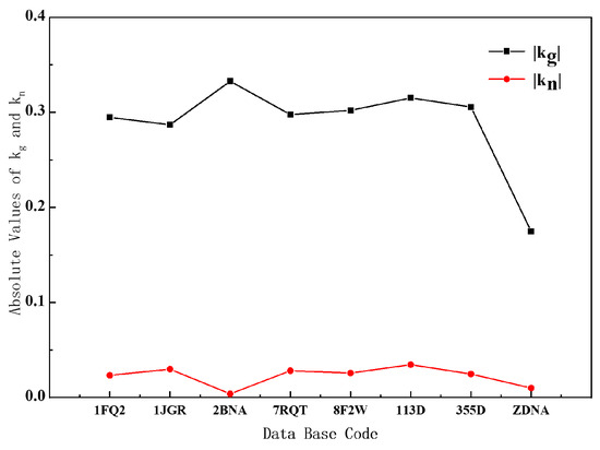The gauge potential of B-DNA is positive, and the distribution of gauge potential and PDB in Figure 3 shows that it is mainly distributed around 0.6 rad. The gauge potential of Z-DNA is negative and its value is mainly around −0.6 rad. This agrees with the results in the literature [19,37]. The mean values of the gauge potentials of the two structures are symmetrically distributed. From the Section 2, we know that the gauge potential describes the rotation angle between consecutive base pairs, and represents the interaction between the base pairs. When the gauge potential is positive, adjacent base pairs rotate counterclockwise and stack sequentially to form a right-handed helix, so the base pair plane shows a negative twisting tendency along the helical axis to form B-DNA. Similarly, when the gauge potential is negative, the adjacent base pairs rotate clockwise and arrange in turn as a left-handed helix, so the base pair plane shows a positive twisting tendency along the helical axis to form Z-DNA. Since the absolute values of the gauge potentials are almost the same, the two structures are chirally symmetric.
