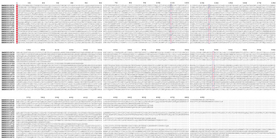 Multiple sequence alignment of Bmtret1 proteins. Conserved sites are indicated by red highlights.