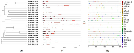 Gene organization of Bmtret1s and cis-elements in promoter regions of Bmtret1s. (a) Phylogenetic tree using 21 Bmtret1s. (b) Exon/intron structures of Bmtret1s. (c) Cis-element distribution in the promoter regions of Bmtret1s.