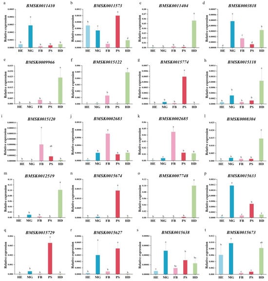 Transcript levels of Bmtret1s in hemolymph, midgut, fat body, posterior silk gland, and head of Bombyx mori. Three biological replicates were analyzed. Different letters indicate statistically significant differences (Duncan’s test, p < 0.05). Values are presented as mean ± SEM. The first three genes belong to branch I, and the expression level of gene of branch II is relatively low. The other genes belong to branch III. (a) BMSK0011410; (b) BMSK0011573; (c) BMSK0011404; (d) BMSK0003818; (e) BMSK0009966; (f) BMSK0015122; (g) BMSK0015774; (h) BMSK0015118; (i) BMSK0015120; (j) BMSK0002683; (k) BMSK0002685; (l) BMSK0008304; (m) BMSK0012519; (n) BMSK0015674; (o) BMSK0007748; (p) BMSK0015633; (q) BMSK0015729; (r) BMSK0015627; (s) BMSK0015638; (t) BMSK0015673.