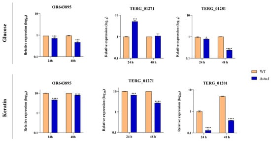 Relative expression analysis of isocitrate lyase (OR643895 and TERG_01271) and malate synthase (TERG_01281) transcripts in wild type (WT) and ΔstuA mutant strains during growth on glucose or keratin. The WT strain served as the control. Statistical significance was determined using an unpaired Student’s t-test with Holm–Sidak correction for multiple comparisons. * p < 0.05, *** p < 0.001, and **** p < 0.0001.