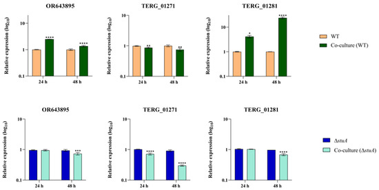 We conducted transcriptional analysis of genes encoding isocitrate lyase and malate synthase in an infection-like scenario in human keratinocytes. Our results revealed different levels of isocitrate lyase (OR643895 and TERG_01271) transcripts during co-culture with the WT strain. We observed an overexpression of OR643895 at 24 and 48 h, whereas TERG_01271 exhibited lower transcript levels during the same period. The gene encoding malate synthase (TERG_01281) was upregulated at 24 and 48 h. During co-culture with the ΔstuA strain, we observed a reduced expression of OR643895 and TERG_01281 only at 48 h post-infection. However, TERG_01271 exhibited decreased transcript levels at 24 and 48 h (Figure 2).