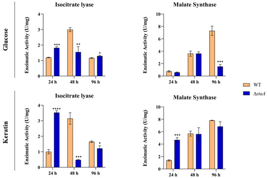 Regarding the enzymatic activity of malate synthase, we observed a substantial decrease in the ΔstuA strain compared to the control after 96 h of growth in glucose. However, during keratin growth, we observed higher enzymatic activity in the mutant at 24 h, with no statistically significant differences in enzymatic activity observed between the mutant and WT during the remaining time intervals (Figure 5).