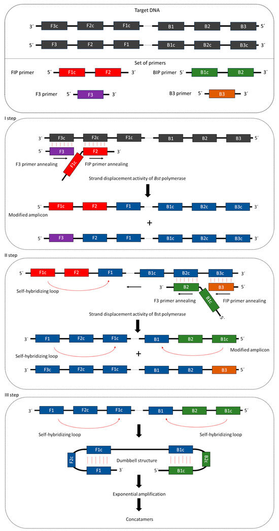 Isothermal amplification of DNA using LAMP requires four or six primers that recognize 6–8 DNA regions. These primers include external primers (forward primer—F3, backward primer—B3), long internal primers (forward internal primer—FIP, backward internal primer—BIP), and loop primers (FL, BL) [91]. The long internal primer sequences, which are approximately 45–49 base pairs (bp), are complementary to two distant sites of the area in which DNA synthesis is initiated. External primers are complementary to external modules, trigger strand replacement, and are shorter than the internal primers (ca. 21–24 bp) [92]. Proper design of primers is a crucial step, especially for internal primers, where modification of the linker, which is expected to provide physical flexibility, can result in sequence interactions that can alter reaction efficiency [93]. Synthesis of the complementary strand in the LAMP reaction is initiated by attachment to the F2 complementary region in the template strand of the internal FIP primer in the DNA template [94]. Subsequently, DNA strand displacement and release occur with the attachment of the external primer F3 to the target DNA region. The released single strand combined with FIB forms a stem-and-loop structure at one end, which initiates BIP-mediated DNA synthesis [95]. The reaction uses polymerase Bst, which localizes external primers and is responsible for elongating strands and forming single-stranded DNA, which is a dumbbell-shaped artificial template [92] (Figure 2). Internal primers are then bound to the stem-loop region, and sequentially repeated strand elongation reactions occur via polymerase [96]. By annealing between alternatively inverted repeats of the target in the same strand, cauliflower- or dumbbell-like structures are formed, which, together with stem-loop DNA structures of different lengths, constitute the mixture of end products of the LAMP reaction [97].