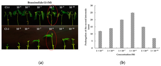 This test has been used in both gibberellins and BRs. For gibberellins, only elongation can be detected, while for BRs curvature, swelling and division of the internode are easily measured [46,47,53,54,55,56,57,58]. The effect on plant tissues depends not only on the structural conformation of the phytohormones but also on the concentration applied, so a dose–response curve of 1 (1 × 10−5–1 × 10−10 M, Figure 4a,b) was obtained to determine the optimal concentration at which tested molecules should be applied.