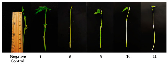 The bean second internode test for compounds 8–11 was carried out using the procedure reported by Slavikova et al., 2008 [60], with some modifications. Bean seeds (Phaseolus vulgaris L., cv. Pinto) were sown and germinated for three days, and then the uniformly germinated seeds were transplanted into pots containing perlite, vermiculite, and a substrate. The pots were kept in a plant growth chamber at 22 °C, with 48 W/m2 light and a 16 h/8 h light/dark photoperiod. When the second internode of bean plants was 1–2 mm long (approx. after 7 days), they were treated with each of the tested compounds dissolved in DMSO and water at a final concentration of 1 × 10−8 M via application on a small scar generated once the bract was removed from the base of the second internode. At the time of application, a 5 µL drop of each solution was mixed with a 2 µL drop of TWEEN® 20 (AMRESCO®) for adhesion.