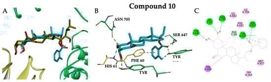 As can be seen in Figure 6A, compound 10 adopts an orientation similar to that found for brassinolide. In the predicted binding position of 10 (Figure 6), six hydrogen bonds were identified. Two of these bonds are formed by the carbonyl group of ArCO, interacting with Tyr 597 and Ser 647 at distances of 2.25 Å and 2.27 Å, respectively. The others are created by interactions between the hydroxyl group at position C-2 and His 61 (at 2.04 Å) and Asn 705 (at 2.09 Å). Additionally, the hydroxyl group at C-3 forms a hydrogen bond with Tyr 642 at 2.13 Å. Another hydrogen bond was observed between the fluorine atom and Tyr 597, with a 2.80 Å distance. Furthermore, the Phe 60 residue engages in π-π stacking with the aromatic ring of compound 10. Finally, 10 participates in van der Waals interactions with Trp 564, Met 657, Phe 681, Ile 706, Ile 682, Phe 60, Tyr 597, Tyr 642, and Tyr 599 (Figure S76, Table S2, Supplementary Material).