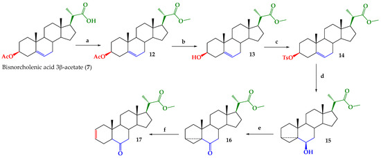 Synthesis of compounds 12–17. Conditions: (a) CH2N2/ether, r.t. 6 h, 99.8%; (b) NaHCO3/MeOH/H2O, reflux, 2 h, 99.1%; (c) TsCl/pyridine/DMAP, 45 °C, 15 h, 79.9%; (d) KAcO/(CH3)2CO/H2O, reflux, 6 h, 66.6%; (e) Jones (CH3)2CO/CH2Cl2/, 5 °C, 2 h, 81.3%; (f) LiBr/PPTS/CH3CON(CH3)2, 160 °C, 3 h, 85.1%.