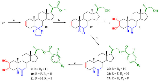 Benzoylation of a primary alcohol in C-22 of hydroxy-ketone 19 with the corresponding benzoyl chlorides [16,50] produces compounds 20–22 with 85.4%, 65.0%, and 72.5%, yields, respectively. Compounds 20–22 were fully characterized using 1D and 2D NMR spectroscopic techniques (see Figures S41–S55, Supplementary Material). Finally, new BRs analogs 9–11 were obtained by the sharpless dihydroxylation of olefins 20–22, with 90.0%, 82.5%, and 84.9% yields, respectively. Compounds 9–11 were fully characterized using IR, 1D, 2D NMR, and HRMS spectroscopic techniques (see Figures S56–S70, Supplementary Material).