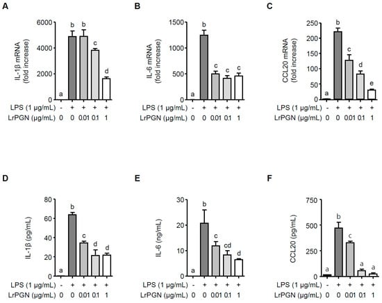LrPGN inhibits P. gingivalis LPS-induced inflammatory responses. RAW 264.7 cells were pretreated with LrPGN (0.01, 0.1, or 1 μg/mL) for 15 h and stimulated with P. gingivalis LPS (1 μg/mL) for an additional 3 h. Total RNA was then extracted, and the mRNA expression of IL-1β (A), IL-6 (B), and CCL20 (C) was determined by qRT-PCR. After LrPGN pretreatment as described above, RAW 264.7 cells were stimulated with P. gingivalis LPS (1 μg/mL) for an additional 24 h. Spent culture supernatants were collected, and the secretion level of IL-1β (D), IL-6 (E), and CCL20 (F) was assessed using ELISA. The results are expressed as mean ± standard deviation, and statistical significance (p < 0.05) was determined by ANOVA. Different letters (a–e) indicate statistical differences between groups.