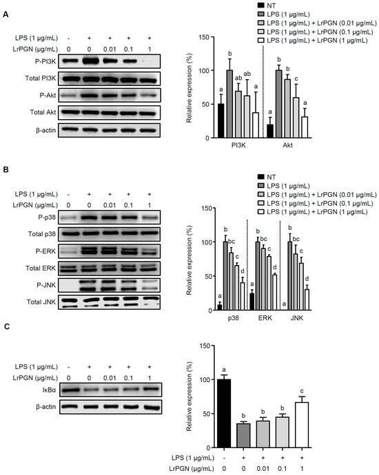 LrPGN attenuates the signaling pathways of PI3K/Akt, MAPKs, and NF-κB induced by P. gingivalis LPS. RAW 264.7 cells were pretreated with LrPGN (0.01, 0.1, or 1 μg/mL) for 15 h and stimulated with P. gingivalis LPS (1 μg/mL) for 30 min. Phosphorylation of PI3K/Akt (A), MAPKs (B), and IκBα degradation (C) was determined via Western blot analysis. The relative expression of PI3K/Akt, MAPKs, and IκBα is presented as the mean ± standard deviation. Statistical significance (p < 0.05) was determined by ANOVA. Different letters (a–d) indicate statistical differences between groups.