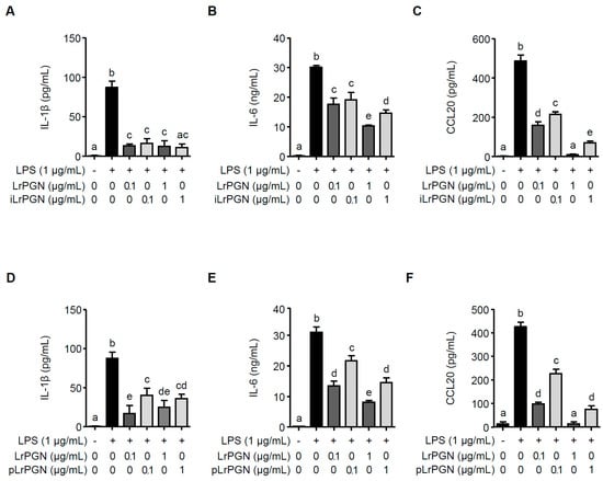 LrPGN exhibits superior potential for inhibiting inflammatory responses induced by P. gingivalis LPS. RAW 264.7 cells were pretreated with LrPGN (0.1 or 1 μg/mL) or iLrPGN (0.1 or 1 μg/mL) for 15 h and stimulated with P. gingivalis LPS (1 μg/mL) for 24 h. After stimulation, the protein secretion of IL-1β (A), IL-6 (B), and CCL20 (C) was assessed using ELISA. RAW 264.7 cells were pretreated with LrPGN (0.1 or 1 μg/mL) or pLrPGN (0.1 or 1 μg/mL) for 15 h and stimulated as described above. After stimulation, the protein secretion of IL-1β (D), IL-6 (E), and CCL20 (F) was assessed using ELISA. The results are expressed as the mean ± standard deviation, and statistical significance (p < 0.05) was determined by ANOVA. Different letters (a–e) indicate statistical differences between groups.
