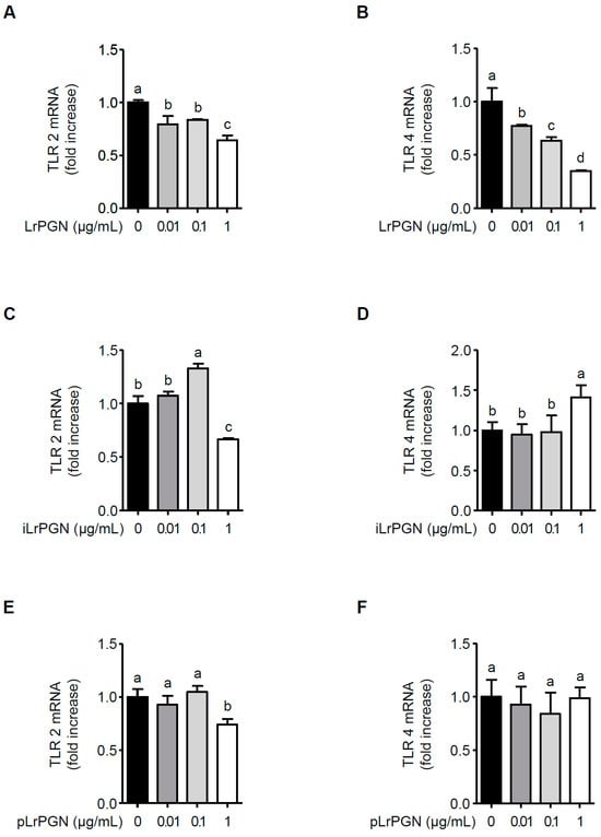 LrPGN significantly suppresses TLR4 mRNA expression. RAW 264.7 cells were pretreated with LrPGN, iLrPGN, or pLrPGN (0.01, 0.1, or 1 μg/mL) for 15 h and stimulated with P. gingivalis LPS (1 μg/mL) for 15 h. Total RNA was extracted, and the mRNA expression levels of TLR2 (A,C,E) and TLR4 (B,D,F) were determined by qRT-PCR. The results are expressed as the mean ± standard deviation, and statistical significance (p < 0.05) was determined by ANOVA. Different letters (a–d) indicate statistical differences between groups.