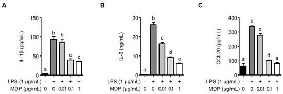 MDP significantly inhibits P. gingivalis LPS-induced inflammatory responses. RAW 264.7 cells were pretreated with MDP (0.01, 0.1, or 1 μg/mL) for 15 h and stimulated with P. gingivalis LPS (1 μg/mL) for 24 h. After stimulation, the protein secretion of IL-1β (A), IL-6 (B), and CCL20 (C) was assessed using ELISA. The results are expressed as the mean ± standard deviation, and statistical significance (p < 0.05) was determined by ANOVA. Different letters (a–e) indicate statistical differences between groups.