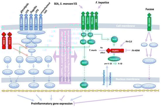 Interaction of helminth antigens with PRRs. Natural ligands of PRRs (TLRs, CLRs, and NLRs) induce a proinflammatory response through the activation of the transcription factors NF-κB, AP-1, CREB, and NFAT. Blue, green, and red arrows represent classical signaling from TLRs, CLRs, and NLRs, respectively. Violet arrows indicate interference of helminths with PRR signaling. The parasites stimulate PRRs directly or interfere with their signaling pathways, inducing a Th2/Threg response. A full description is given in the text (Section 3.1). Fh-CL3—F. hepatica cathepsin L3, Fh-HDM—fasciola hepatica helminth defense molecule, SEA—schistosoma-soluble egg antigens.