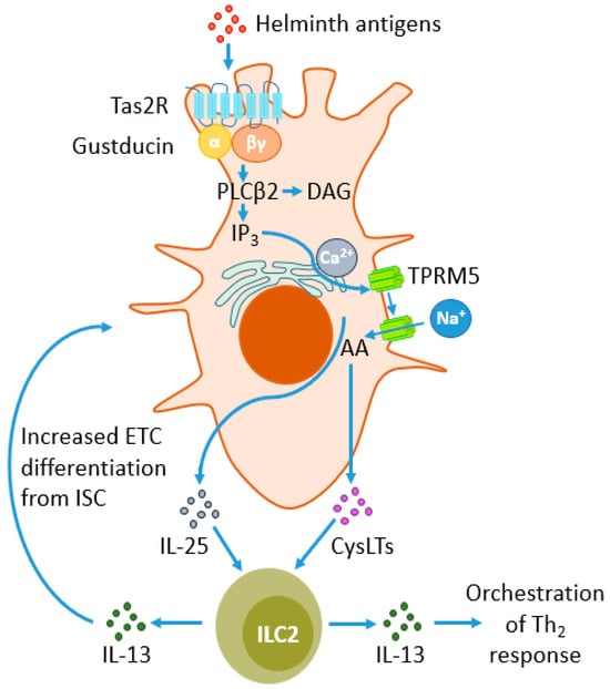 Response of enteric tuft cells (ETCs) to parasite antigens and their impact on type 2 innate lymphoid cells (ILC2s). Type 2 taste receptors (TAS2Rs) belong to G protein-coupled receptors (GPCRs) and sense parasites’ antigens, signaling through the G protein gustducin. Gustducin activates phospholipase β2 (PLCβ2), which hydrolyzes phosphatidylinositol biphosphate (PIP2) to diacylglycerol (DAG) and inositol trisphosphate (IP3). The latter compound induces the migration of calcium from the endoplasmic reticulum (ER) towards the cytoplasm, facilitating the influx of sodium ions into the cell through transient receptor potential cation channel subfamily M member 5 (TRPM5). This leads to the metabolism of arachidonic acid (AA) to cysteine leukotrienes (CysLTs) and the release of CysLTs and IL-25. Both mediators stimulate ILC2s to release IL-13, a powerful modulator of the Th2 response. There is also a positive feedback loop between the secretion of IL-25 and CysLT from ETC. ILC2s, through the release of IL-13, stimulate intestinal stem cells (ISC) to differentiate into ETC, increasing their number during helminth infections.