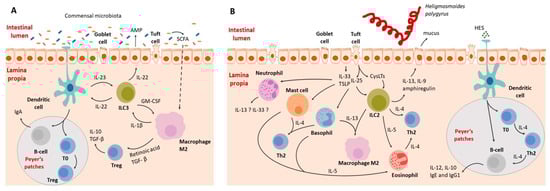 Schematic representation of the interaction between the intestinal immune system during homeostasis (A) and helminth-induced inflammation (B). (A) Interactions between the immune system and gut microbiota. Dendritic cells function through both antigen presentation to naive B and T cells and by secreting IL-23, activating type 3 innate lymphoid cells (ILC3). Activated ILC3s release IL-22 and granulocyte–macrophage colony-stimulating factor (GM-CSF). IL-22 activates the epithelium, leading to the secretion of antimicrobial peptides (AMP) and an increase in IL-23 production by dendritic cells. Bacterial metabolites also directly interact with the immune system. For example, short-chain fatty acids (SCFAs) penetrate the epithelial barrier and upregulate anti-inflammatory cytokines. T regulatory cells are crucial for maintaining tolerance towards commensal microbiota. (B) Immune system–helminth interactions, illustrated using the example of H. polygyrus. Intestinal parasites release enzymes that digest the mucosal barrier, causing epithelial cell death. In response to the damage, intestinal epithelial cells release alarmins (IL-25, IL-33, TSLP), activating immune system cells. Alarmins activate basophils, mast cells, ILC2s, and neutrophils. Subsequently, eosinophils are activated by IL-5, Th2 cells by IL-4, and type 2 macrophages by IL-13. The role of neutrophils in the development of type 2 responses is not fully understood yet, but there is a suspicion that they may be capable of secreting IL-13 and IL-33. Other cells contribute to the inflammatory response, recruitment of immune cells, and coordination of the immune reaction.