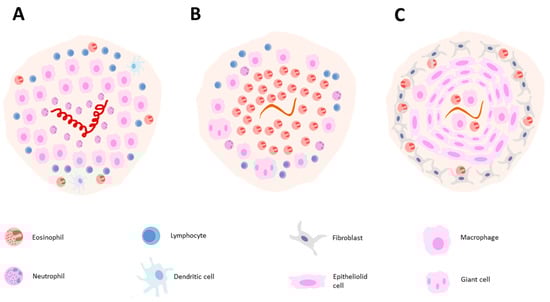 Certain helminths, such as T. canis, S. japonicum, and H. polygyrus, have the ability to trigger an immune response that results in the formation of a specific structure known as a granuloma. A granuloma is a well-organized, compact structure that develops during extended immune responses to persistent pathological stimuli that cannot be eradicated through acute inflammatory processes. The term “granuloma” was first coined in the latter half of the 19th century to describe changes in lungs affected by tuberculosis []. Over time, it became evident that granulomas form not only in response to bacterial infections like tuberculosis but also in the presence of other pathogens (viruses, parasites, and fungi), as well as non-infectious agents, such as autoimmune diseases like Crohn’s disease and foreign bodies []. One distinctive feature of granulomas, in contrast to typical chronic inflammatory infiltrates, is the characteristic organization of specialized forms of macrophages: epithelioid cells and giant cells.