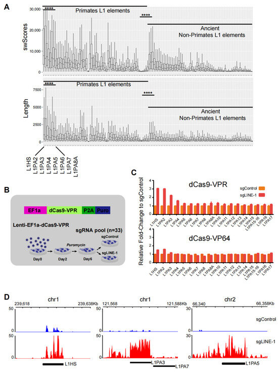 We designed 33 sgRNAs that are specifically targeted to the 5′ UTR of the L1HS and the indicated L1PA subfamilies. A total of 16,635 L1 loci were predicted to be targeted, covering all L1 subfamilies. The sgRNAs were designed using the MIT guide RNA design tool (www.CRISPR.MIT.edu (accessed on 6 April 2021)) or http://crispor.tefor.net/ (accessed on 6 April 2021). Guide RNA design and the sequences can be found in Supplementary Tables S1, S3 and S4.