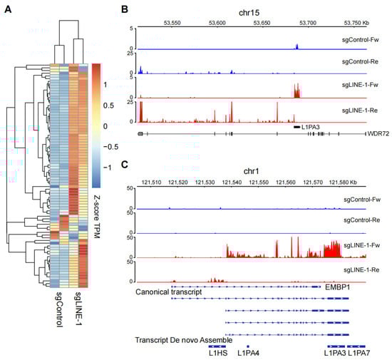 The RNA sequencing reads were mapped to the Homo sapiens hg38 reference assembly using Hisat2 [31]. The gene annotation Genecode v29 was downloaded from “https://www.gencodegenes.org/ (accessed on 11 August 2022)” and raw counts were performed by FeatureCounts [32]. Then, raw counts of all genes were normalized by TPM (transcript per million). Differential expression analysis was performed by DEseq2 [32]. Genes with abs|log2(fold-change) > 0.75 and P-adj < 0.05 were considered differentially expressed genes (DEGs). RNA-seq data were aligned to the hg38 genome by Hisat2. The L1 reads were randomly assigned once. The de novo transcript assembly was performed by Stringtie [31], with a parameter of: -m 500 -a 20.