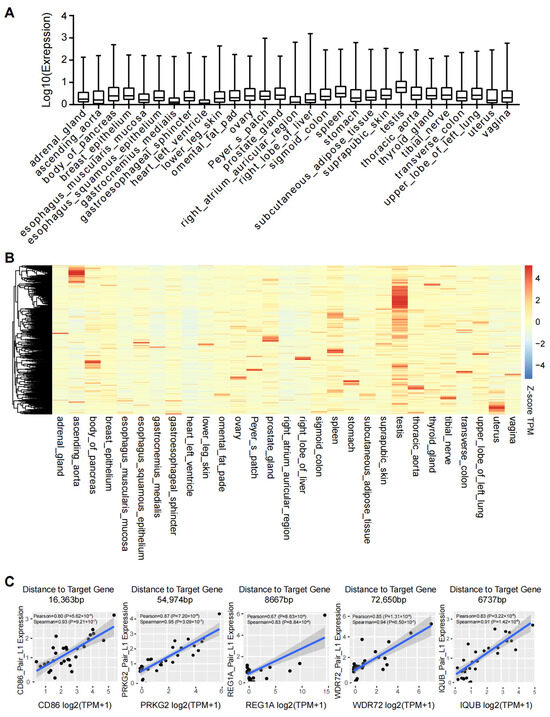 To understand the L1 function in normal physiological conditions, we analyzed L1 expression from 29 human tissues and organs. The results of quantification showed that the overall expression levels of L1s varied among different tissues or organs, with the highest expression observed in the testis (Figure 5A). The expression of L1s displayed a tissue-specific pattern (Figure 5B). For instance, L1HS was abundantly expressed in the thyroid_gland and prostate_gland, L1PA2 was highly enriched in the thoracic aorta, and L1PA3 was more expressed in the pancreas, as shown in the heat map. These observations were in line with the fact that L1s are transcribed in a cell-type-specific manner and that tissue-specific active promoters are enriched with the L1 family of transposons [25]. Nevertheless, certain L1s are co-expressed with protein-coding genes in multiple human tissues (Figure 5C), which implies that they may have general functions.