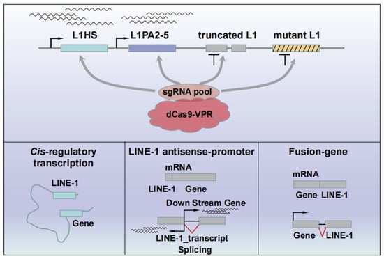 Our current understanding of L1 function has been primarily based on loss-of-function studies, and gain-of-function studies have been scarce [18]. By fusing transcription activators with dCas9, gene activation can be achieved by the introduction of single-guide RNAs (sgRNAs) [19,20]. Here, we applied the CRISPRa method to study the activation of L1 elements in L02 cells. After CRISPRa, the young L1 subfamilies are found to be expressed at higher levels than the older L1s. The L1s with high levels of transcription are closer to full-length and are more densely occupied by the YY1 transcription factor. The activated L1s can either be mis-spliced to form chimeric transcripts or act as alternative promoters or enhancers to facilitate the expression of neighboring genes.