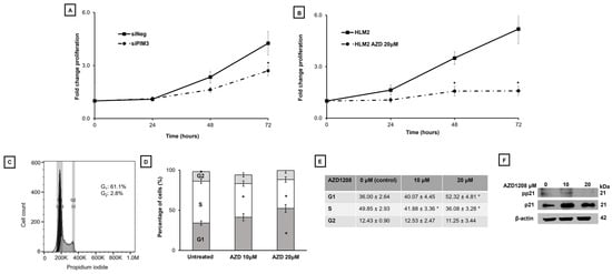 PIM kinase inhibition results in decreased metastatic hepatoblastoma cell proliferation and cell cycle progression. (A) After siRNA knockdown of PIM3, 5 × 105 HLM_2 cells were plated and counted over the course of 72 h. There was a significant decrease in HLM_2 proliferation with decreased PIM3 expression compared to control at 72 h (4.2 ± 0.7 v. 1.2 ± 0.3, p ≤ 0.05). (B) HLM_2 cells (5 × 104 cells per well) were plated in 12-well plates, allowed to adhere, and treated with AZD1208 (0, 20 µM) for 24, 48, or 72 h. There was a significant decrease in proliferation at 48 h (3.5 ± 0.4 v. 1.6 ± 0.3, p ≤ 0.05) and at 72 h (5.2 ± 0.9 v. 1.6 ± 0.3, p ≤ 0.05) after PIM kinase inhibition. (C) HLM_2 cells (1 × 106) were plated in low serum (4% FBS) media, allowed to attach, and incubated for 24 h with AZD1208 (0, 10, 20 µM). Flow cytometry was utilized to assess the effects of PIM kinase inhibition on the cell cycle. A representative histogram is presented. (D) Graphic and (E) tabular representation of the results (mean percent cells in phase ± SEM) of the cell cycle analysis from three biologic replicates are shown. Treatment with AZD1208 decreased progression of G1 to S phase as demonstrated by the decrease in the percentage of cells in the S phase (49.85 ± 2.93 v. 36.08 ± 2.47, control v. AZD1208 20 µM, p ≤ 0.05) and a statistically significant increase in the percentage of cells in G1 (36.00 ± 2.64 v. 52.32 ± 4.81, control v. AZD1208 20 µM, p ≤ 0.05) after treatment. (F) Immunoblotting demonstrates a decrease in the phosphorylation of p21 after treatment with AZD1208. Total p21 expression remained stable. β-actin served as a loading control. Data are reported as mean ± standard error of the mean (SEM) and represent at least three biologic replicates. * p ≤ 0.05.