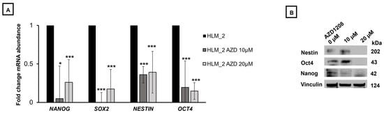 Prior studies have demonstrated that PIM kinases support the stem cell-like cancer cell (SCLCC) phenotype in primary hepatoblastoma which may play an important role in the progression of metastatic disease [10]. We noted that the metastatic hepatoblastoma cell line, HLM_2, had higher levels of mRNA abundance of stemness markers Oct4, Nanog, Nestin, and Sox2 compared to the parent cell line, HuH6 [9], so we sought to explore the effects of PIM kinase inhibition on metastatic hepatoblastoma stemness. Using qPCR, we evaluated the change in mRNA abundance of known stemness markers Nanog, Sox2, Nestin, and Oct4. Treatment with AZD1208 (10 µM) decreased the expression of each of the markers; Nanog (1.00 ± 0.0 v. 0.45 ± 0.47, untreated v. AZD1208, p ≤ 0.05), Sox2 (1.00 ± 0.0 v. 0.25 ± 0.34, untreated v. AZD1208, p ≤ 0.001), Nestin (1.00 ± 0.0 v. 0.69 ± 0.11, untreated v. AZD1208, p ≤ 0.001), and Oct4 (1.00 ± 0.0 v. 0.39 ± 0.39, untreated v. AZD1208, p ≤ 0.01), (Figure 2A). Similar results were seen with treatment with increased concentration of AZD1208 (20 µM), with a decreased expression of Nanog, Sox2, Nestin, and Oct4, (Figure 2A). After demonstrating knockdown at the mRNA level, we then used immunoblotting to evaluate changes at the protein level. Immunoblotting demonstrated a decrease in protein expression of stemness markers Nestin, Oct4, and Nanog with increase concentrations of AZD1208 (0–20 µM). Vinculin served as a loading control (Figure 2B).