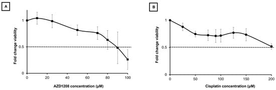 The alamarBlue Cell Viability Assay (Thermo Fisher Scientific) was used to measure cell viability. HLM_2 cells (1.5 × 106 per well) were plated in 96-well plates and treated with increasing concentrations of AZD1208 (0–125 µM) or cisplatin (0–200 µM). Following 72 h of treatment, 10 µL of alamarBlue reagent was added to each well and the absorbance was measured at excitation wavelength of 562 nm and emission wavelength of 595 nm using a microplate reader (BioTek Gen5, BioTek, Winooski, VT, USA). For combination studies, HLM_2 cells were treated with either AZD1208 alone, cisplatin alone, or a combination of AZD1208 and cisplatin at varying concentrations for 72 h. The median lethal dose (LD50) of each drug and their combinations was determined. Isobolograms were constructed and combination indices (CI) were calculated using the method of Chou and Talalay with CI values less than 1 indicating synergy, equal to 1 indicating an additive effect, and more than 1 indicating antagonism [12].