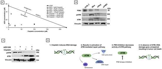 Treatment of HLM_2 cells with AZD1208 and cisplatin is synergistic. (A) HLM_2 cells (1.5 × 103 per well) were plated in 96-well plates and treated with combinations of AZD1208 and cisplatin at concentrations below the LD50 of AZD1208 (0–60 µM) and cisplatin (0–200 µM). Isobolograms were constructed, and combination indices (CIs) determined. Each combination of therapy resulted in synergy (CI < 1) between the two agents. (B) Immunoblotting demonstrated a decrease in pATM, a modulator of DNA repair, after knockdown of PIM3, suggesting a mechanism for the observed synergy. (C) Immunoblotting showed that cisplatin increased total ATM expression. Treatment with pan-PIM inhibitor, AZD1208 (50 µM), resulted in decreased pATM and prevented the phosphorylation of the cisplatin-induced increase in total ATM. (D) The proposed mechanism of synergy between PIM inhibition and cisplatin is depicted in the cartoon. Cisplatin induces DNA damage which some tumor cells may evade by activating ATM and its downstream targets. PIM kinase inhibition decreases phosphorylated ATM, the active form, allowing for cisplatin-induced DNA damage to commence. This pathway plays a critical role in cell cycle arrest, DNA repair, and senescence. Created with biorender.com [13].