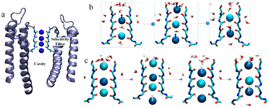 Potassium channels have strong selectivity for K+ and an osmotic efficiency for K+ close to the diffusion limit [1,12,13,14,15]. Common to all potassium channels is the highly conserved SF region, a portion of the residue sequence is T-V-G-Y-G. The SF region underlies the precise selection of K+ and the high conductance of potassium channels [12,16,17]. The high-resolution structure of KcsA, a prokaryotic potassium channel, provides a direct structural basis for probing the function and behavior of eukaryotic potassium channels. The overall structural architecture of KcsA is a cross-symmetric tetramer with four subunits surrounding a central channel [18,19,20]. The channel can be divided into three regions from intracellular to extracellular: gate, Cavity, and the SF. The crystal structure of the potassium channel derived by MacKinnon and colleagues shows a string of distinct ion-binding sites within the cylindrical SF, as shown in Figure 1a [12,18]. Instead of forming a continuous chain, they suggest that the potassium ions are alternately bound to intervening water molecules, which weaken the large Coulomb repulsive forces generated by the direct contact of the cations, as shown in Figure 1b [14,21,22,23]. An alternative view is presented by Köpfer et al. In their extensive molecular dynamics simulations of K+ conduction through various potassium channels, they found that K+ ions contact each other directly along the single file, with few water molecules appearing in between, as shown in Figure 1c [23,24,25]. They suggested that direct Coulomb knock-on between the contacting cations enhanced ionic conduction. Sumikama et al. proposed a new view, queueing arrival and release mechanism. They argued that the mechanism that occurs during the transport of K+ is related to its concentration in the system, that the higher the concentration of K+ the fewer water molecules there will be at the SF site, and that there should not be a single permeation mechanism [26]. In our previous work, we found that the direct Coulomb knock-on mechanism is the most efficient for the transport rate of K+ and is the dominant permeation mechanism throughout the simulation [27].