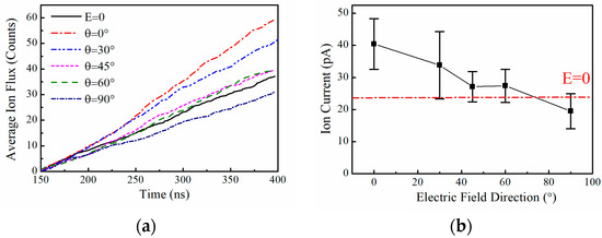 We chose to simulate the applied electric field with an amplitude of 0.4 V/nm, a frequency of 51.87 THz, and an incidence direction of the electric field of θ, which is the angle between the incident electric field and the z-axis (in the XOZ plane), as 0°, 30°, 45°, 60°, and 90°, respectively. We simulated the case of the channel with the applied electric field at different angles independently several times, with a total simulation time of 3.2 us for each angle, and then statistically averaged the simulation results. Figure 2 shows the relationship between the ion flux and current and the angle θ of the applied electric field when the amplitude of the applied electric field is 0.4 V/nm and the frequency is 51.87 THz, where E = 0 is the case without the applied field. It can be seen that when the electric field is incident along the z-axis, i.e., along the flow direction of K+, the ion flux is the largest, which is about 1.8 times that in the absence of the applied field. When the electric field is incident along the x-axis, i.e., perpendicular to the flow direction of K+, the ion flux is the smallest, which is slightly smaller than that without the applied field. Therefore, a change in the direction of an applied electric field of the same frequency and amplitude also affects the K+ flux in the KcsA channel. In experimental applications, the beams of THz lasers are generally at the millimeter scale, and the sizes of eukaryotic and prokaryotic cells are at the micrometer scale, which makes it difficult to ensure that the direction of the THz wave incident on each K+ channel is maintained [34]. From examining the relationship between the direction of the applied electric field and the ion current in Figure 2b, it can be seen that even though it is difficult to ensure that the direction of the applied electric field is maintained strictly along the direction of the ion current, the electric field at this frequency still increases the K+ current in the whole cell.