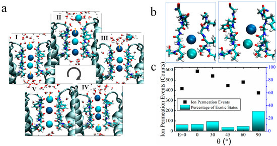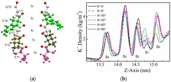 We further analyzed the state of K+ ions at the SF sites as they pass through the channel. Based on previous articles, it can be seen that the high-speed transport of K+ via potassium channels mainly passes via the mechanism of direct Coulomb knock-on [24,25,27], as shown in Figure 4a. K+ is dehydrated from the Cavity region into the SF region and then passes through each site sequentially to complete single permeation. When the channel structure is unstable, some other permeation mechanism occurs, such as between neighboring K+ in the SF being spaced apart by water molecules. We analyzed the ion configuration states in the SF region under the action of an applied electric field with different orientations but the same frequency (51.87 THz) by counting the simulation results from every 5 ns. It is found that two singular states tend to appear during the simulation at θ = 90°, as shown in Figure 3b. K+ always stays in the SF region in a state occupying the ‘S4, S3’ or ‘S3, S2’ sites, and experiences difficulty in reaching the next site to rapidly complete the permeation of K+. The probability of the two states ‘S4, S3’, ‘S3, S2’ appearing in the simulation with θ = 90° is about 31% and the least number of ion permeation events within 3.2 μs at this angle. In contrast, the probability of these two states appearing in the simulation with the electric field at other angles as well as in the simulation without the applied field is lower than 15%, and the ion permeation events are both increased compared to the case without the applied electric field.
