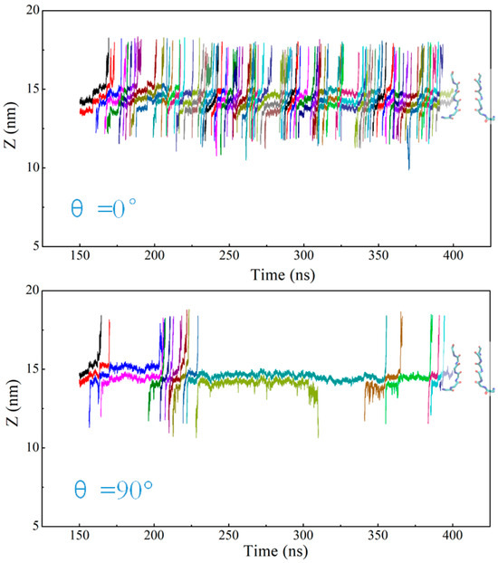 For the cases of applied electric field direction θ = 0° and θ = 90°, we randomly selected the simulation results for a period of time to analyze the ion trajectories, as shown in Figure 5. At θ = 0°, K+ in the channel mainly passes through the SF region in the mode of direct Coulomb knock-on, and the channel realizes efficient transport of K+. At θ = 90°, K+ also mainly passes through the SF region in the mechanism of direct knock-on to realize ion permeation, but the appearance of (S3, S2) and (S4, S3) states slows down the rate of K+ through the channel. As can be seen from Figure 5, when potassium ions appear in the SF in these two states, K+ takes a longer time to reach the next site and stay in the S2 or S3 site for a long time, while K+ passes through the channel rapidly after reaching the next site.