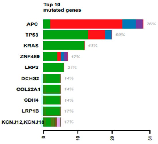 It is largely recognized that CRC cells hold driver mutations in specific genes (i.e., APC, KRAS, BRAF, PIK3CA, and TP53). Therefore, we decided to investigate the mutation spectrum of these genes in our cohort. Using the TCGA database [