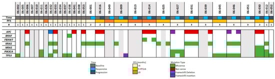 Blood samples were taken at different time points from each patient, and cfDNA was extracted from plasma. For this analysis, only the baseline sample was profiled when patients did not provide any blood samples between the blood collection at baseline and clinical progression. For patients with an ARES overall response (i.e., one evaluation with a PR or SD overall response before PD), three time points were profiled: baseline, responses, and progression. In total, 70 samples from 39 patients had enough DNA to be profiled using the Oncomine Colon cfDNA assay, including a panel of 14 genes. Following sequencing quality control, 55 samples were left from 31 patients, and at least one mutation was detected in 38 samples from 23 patients (see