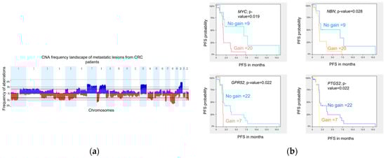 We investigated whether CNA in metastatic lesions could be associated with patient outcome. Using a log-rank statistic test, we identified 9 and 29 regions of copy number loss and gain, respectively, associated with PFS (permutated
