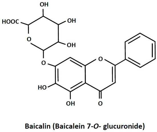 Baicalin is a plant-derived biologically active compound. It is present in high amounts in Scutellaria baicalensis [1]. Plants abundant in baicalin are widely applied in traditional medicine for treating inflammation-related diseases, dysentery, hypertension, hemorrhage, insomnia, diabetes and its complications, and others [2,3,4,5]. Apart from therapies based on plants rich in baicalin, the pure compound is recommended in humans as a dietary health-promoting supplement [2,6]. Baicalin (7-glucuronic acid, 5,6-dihydroxy-flavone; Figure 1) is a polar glycosidic flavone. Its water solubility is relatively low and reaches about 70 mg/L. Due to its chemical properties, the absorption of baicalin from the digestive tract is quite small. It is estimated that only a few percent of the ingested compound is absorbed. However, a large part of baicalin undergoes conversion to its aglycone form, baicalein, the absorption of which is much higher. It was also shown that, after baicalin ingestion, this compound appears in the blood and reaches numerous tissues [7,8]. Despite relatively low absorption, baicalin supplementation was effective in various pathological conditions. This points out that baicalin has a large therapeutic potential. Moreover, interest in baicalin as a natural health-promoting agent is still increasing [2,6].
