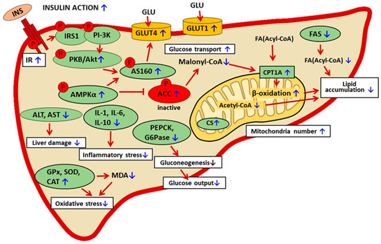 In the muscle tissue, baicalin was shown to reduce lipid accumulation. This effect resulted from alterations in phosphorylation and the action of enzymes involved in the regulation of lipid metabolism. Baicalin therapy was associated with phosphorylation of AMPKα at the activation site of the enzyme. Activated AMPK induced phosphorylation of ACC at the inhibitory site. Moreover, baicalin treatment was demonstrated to reduce the skeletal muscle content of a key signaling molecule involved in the regulation of lipid metabolism, i.e., malonyl-CoA. All these changes promoted the mitochondrial oxidation of FAs and thereby diminished lipid accumulation. Baicalin increased the phosphorylation of intracellular molecules related to insulin signaling, PKB/Akt, and GSK-3β and also up-regulated the expression of PGC-1α, p38MAPK, and p-AS160. It was also demonstrated that baicalin elevated the expression level of the insulin-regulated glucose transporter GLUT4. These changes indicate that baicalin improved insulin sensitivity in the muscle tissue and increased intramuscular glucose transport. Given that the skeletal muscle is responsible for the main glucose uptake, this effect contributes to the blood-glucose-lowering action of baicalin. Baicalin was also demonstrated to diminish adipose tissue content. This effect was due to increased AMPK-dependent mitochondrial biogenesis and the resulting rise in metabolic activity. Reduced adipose tissue content was associated with decreased inflammatory markers and macrophage accumulation. These effects contribute to better adipose tissue insulin action. The beneficial influence of baicalin on insulin action shown in the liver tissue was largely due to reduced lipid accumulation. This resulted from both increased FA degradation and reduced FA synthesis. The former was due to AMPK activation and ACC inhibition and also reduced malonyl-CoA content. This eliminated the inhibitory effect of malonyl-CoA on FAs transport to mitochondria and their oxidation; moreover, it was confirmed that baicalin increased both CPT1A activity and β-oxidation. Baicalin therapy also increased the expression of hepatic glucose transporters (GLUT1 and GLUT4) and reduced the expression of enzymes involved in glucose formation (PEPCK and G6Pase). This indicates that baicalin increased glucose uptake and simultaneously reduced glucose release. These changes largely contribute to the blood-glucose-lowering action.