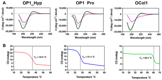 (A) CD spectra at 10 °C (black line), 70 °C (purple line), and 10 °C after denaturation and refolding (green dashed line) for OP1_Hyp, OP1_Pro, and OCol1. The vertical axis measures mean residue ellipticity Θ in degrees cm2 dmol−1. CD data were collected between 190 and 260 nm. (B) Thermal denaturation of OP1_Hyp (red line), OP1_Pro (blue line), and OCol1 (green line) was monitored by the change of CD at 220 nm as a function of increasing temperature between 10 °C and 70 °C at a heating rate of 1 °C/min. Concentrations were 0.5 mg/mL for OP1_Hyp and OP1_Pro (210 µM) and 0.2 mg/mL for OCol1 (12 µM), in CD Buffer pH 7.4.