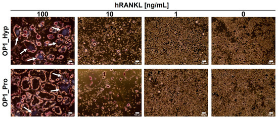 TRAP straining of Raw 264.7 cells were cultured for 5 days on OP1_Hyp/OP1_Pro-coated 24-well plates. Different concentrations of hRANKL (0–100 ng/mL) were used. Cells were fixed and stained to detect TRAP activity. TRAP-positive cells (violet-labelled, pointed by white arrows) with at least three nuclei were considered osteoclasts. Scale bar = 100 µm, 10× magnification.