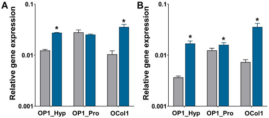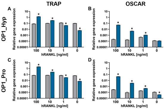 Gene expression of TRAP (A,C) and OSCAR (B,D) relative to GAPDH by Raw 264.7 cells (n = 3) after 24 h (grey bars) and five days (blue bars) cultured on OP1_Hyp (A,B) and OP1_Pro (C,D) with different concentrations of hRANKL (0–100 ng/mL). All data are shown as mean ± SD; * p < 0.05.