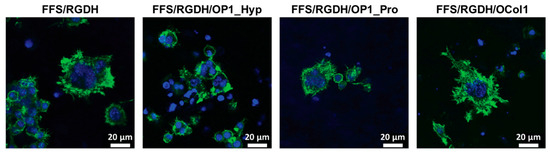 Raw 264.7 cell morphology. Fluorescence images of Raw 264.7 cells after seven days of culture on FF/S/RGDH hydrogels, either unmodified or with incorporated OP1_Hyp, OP1_Pro, or OCol1, were treated with 10 ng/mL of hRANKL (green: F-actin, Alexa Fluor 488 Phalloidin; blue: Nuclei, Hoechst 33342; scale bars 20 μm).