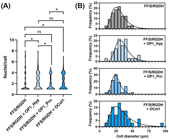 Multinucleation was also assessed by counting the number of nuclei/cells. Compared to unmodified FF/S/RGDH, OP1_Hyp-modified and OCol1-modified hydrogels demonstrated a higher proportion of multinucleated cells (3–5 nuclei/cell), with statistically significant differences (p = 0.013 and 0.045, respectively). Significant differences were also observed for OP1_Hyp-modified or OCol1-modified hydrogels compared to their OP1_Pro-modified counterparts (p = 0.012 and 0.040, respectively), while no significant difference was observed between hydrogels modified with OP1_Hyp and OCol1 (p = 0.669) or between the unmodified hydrogel and the OP1_Pro-modified one (p = 0.938) (Figure 6A). Raw 264.7 cells cultured on OP1_Hyp-modified hydrogels showed a significant increase in diameter compared to FF/S/RGDH, with a lognormal distribution (µ = 33.85, σ = 1.34) shifted towards larger cell diameters compared to the other hydrogel substrates (µ = 28.76, σ = 1.44 for FF/S/RGDH; µ = 25.33, σ = 1.27 for FF/S/RGDH+OP1_Pro; and µ = 30.82, σ = 1.59 for FF/S/RGDH+OCol1) (Figure 6B). Cells cultured on the different collagen-modified hydrogels showed typical features of mature OCs (e.g., a ruffled border, a dense actin ring, and multiple nuclei per cell). These results are in line with those described by Barrow et al., where OSCAR-binding peptides were able to act as co-stimulatory factors for OC differentiation [5]. Here, although all three collagen-modified hydrogels triggered the differentiation of Raw 264.7 cells, the effect was more evident with OP1_Hyp.