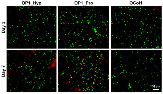 These results agree with our previous observations. Indeed, OP1_Hyp has been shown to interact more efficiently with OSCAR (Figure 2) and to have higher thermal stability (Figure 1B) due to the presence of Hyp in the GAOGPAGFA OSCAR-binding sequence. For this reason, Raw 264.7 cells may have a stronger affinity for OP1_Hyp, and therefore the differentiation effect (as shown by OC features in Figure 5 and Figure 6) may be more pronounced. Additionally, the viability of Raw 264.7 cells cultured on the collagen-modified hydrogels was analysed via a LIVE/DEAD assay (Figure 7).